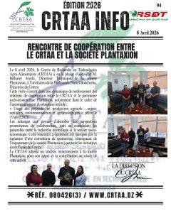 Le 8 avril 2026, le Centre de Recherche en Technologies Agro-Alimentaires (CRTAA) a eu le plaisir d’accueillir M. Belharet Arezki, Directeur Technique de la société Plantaxion, à l’invitation de la […]
