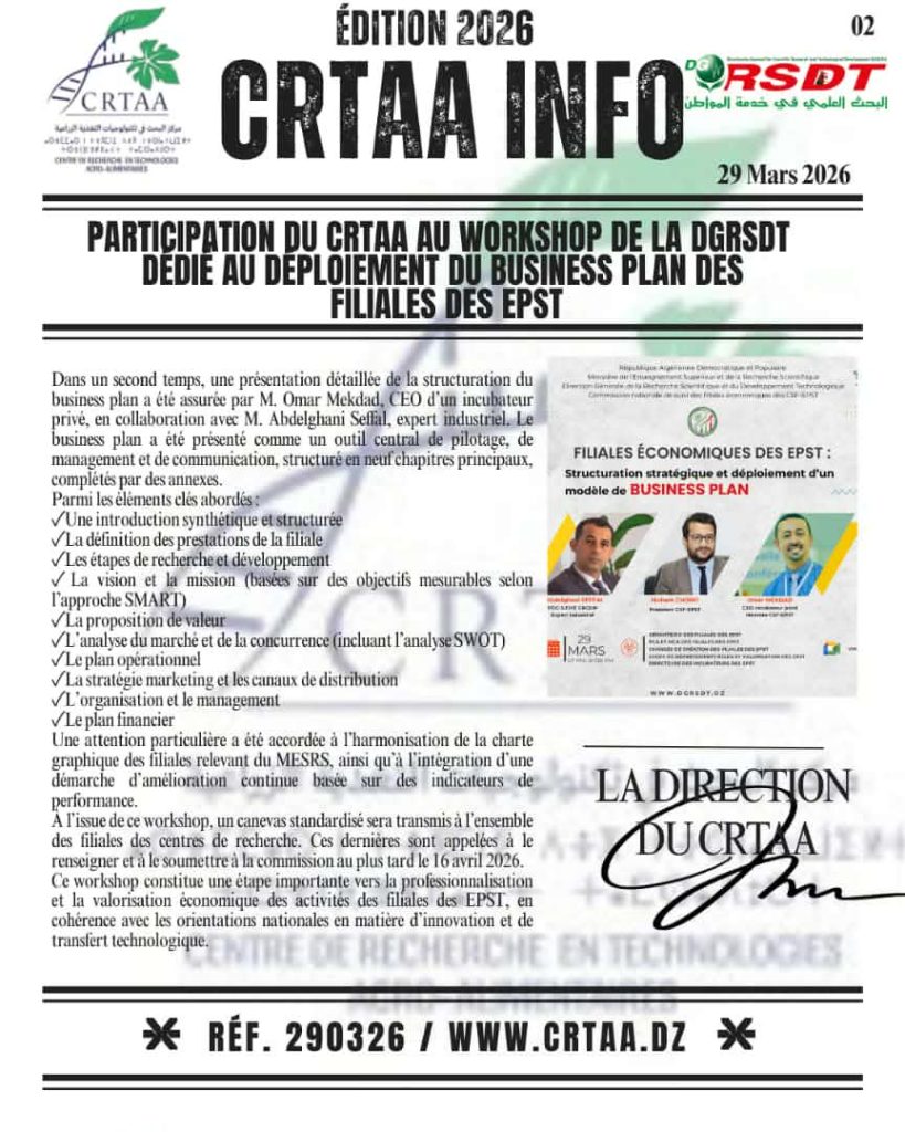 Dans le cadre du renforcement des bonnes pratiques de laboratoire et de la maîtrise des risques au sein du Centre de Recherche en Technologies Agro-Alimentaires (CRTAA), nous avons le plaisir