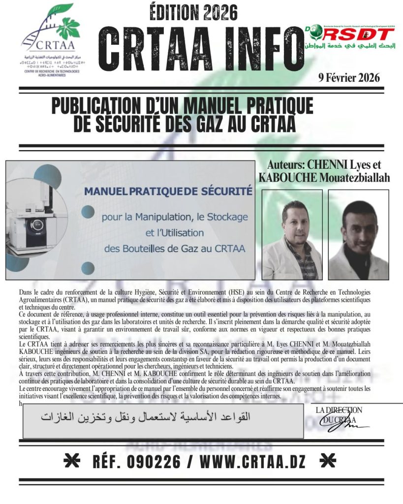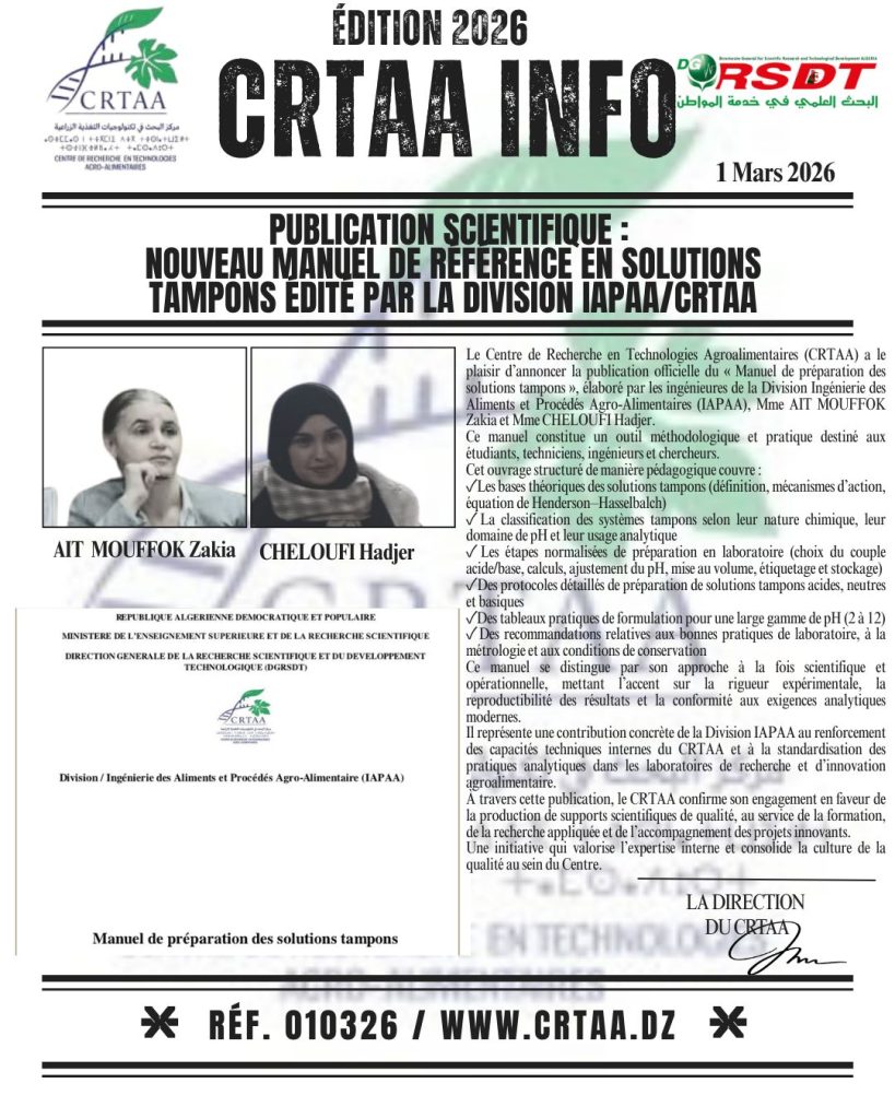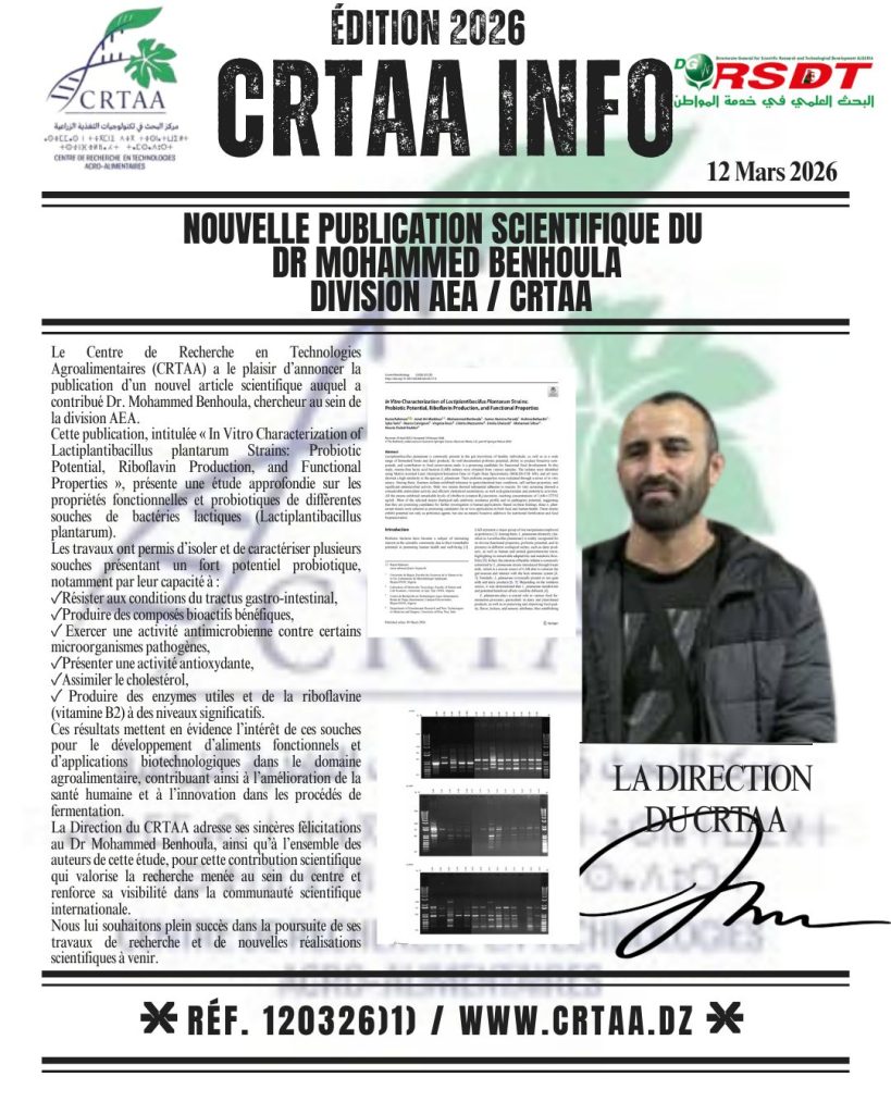 Dans le cadre de l’accompagnement scientifique des projets innovants incubés au Centre de Recherche en Technologies Agroalimentaires (CRTAA), les porteurs du projet MS-26 (FARIDA, SARA, CHIRAZ, KOUSSEILA, ADEL et ISLEM) […]