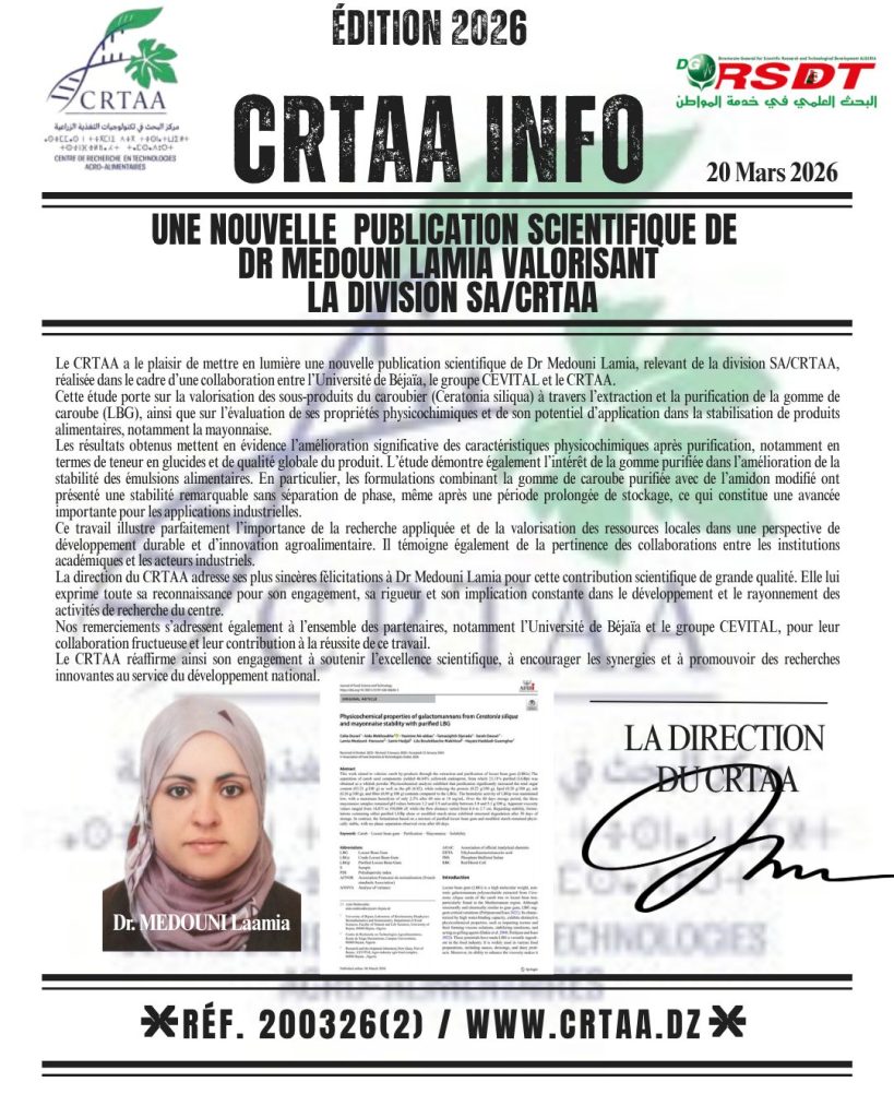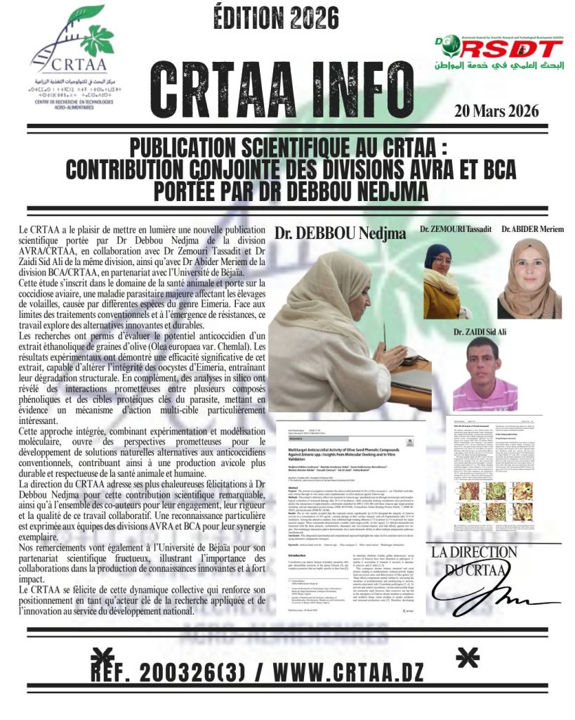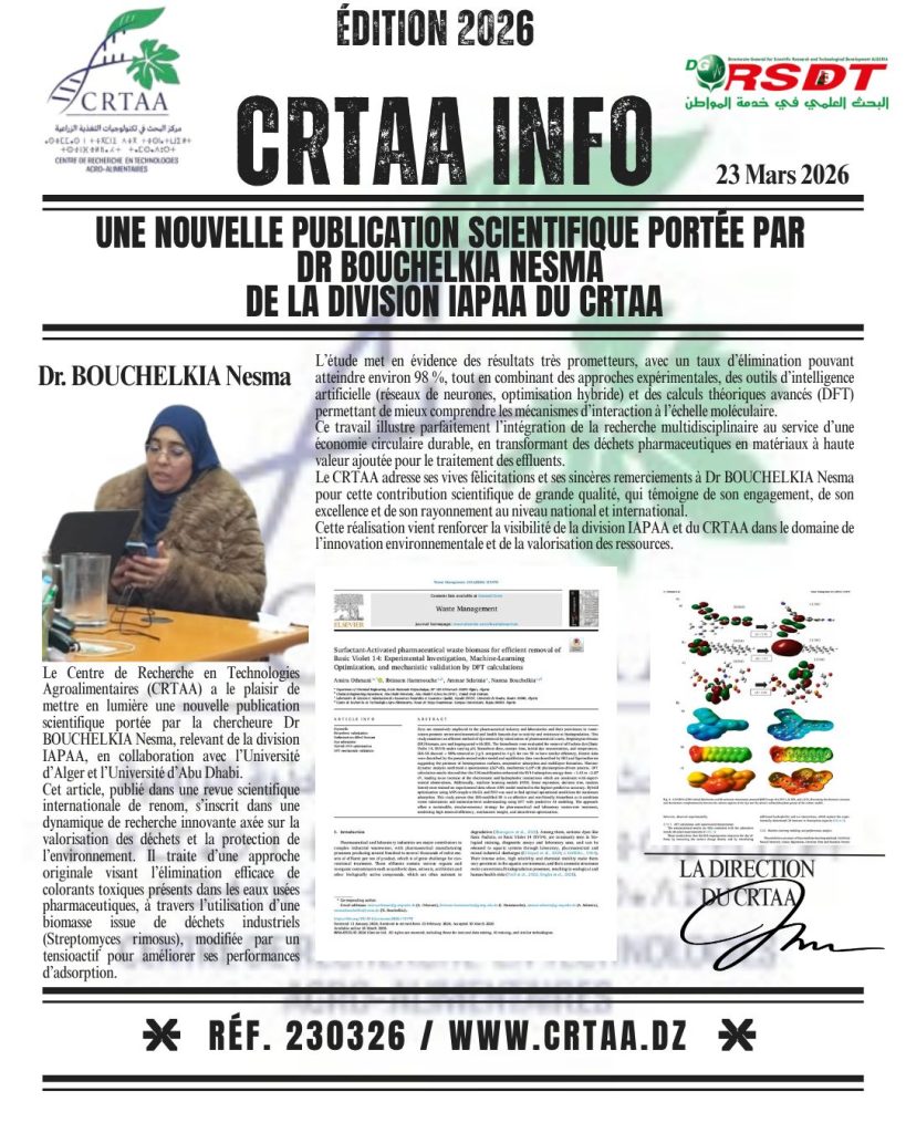 Le Centre de Recherche en Technologies Agroalimentaires (CRTAA) a le plaisir de mettre en lumière une nouvelle publication scientifique portée par la chercheure Dr BOUCHELKIA Nesma, relevant de la division […]