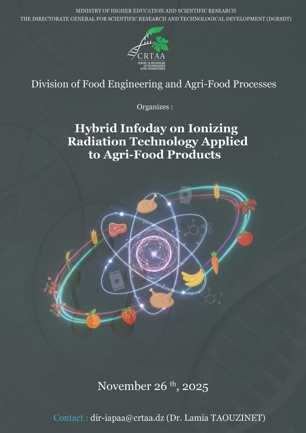 Auditorium de Targua Ouzemmour Q22R+475, Targa ouzemour, Béjaïa, Bejaia, AlgeriaLe CRTAA organise une journée scientifique dédiée aux principes fondamentaux de l’irradiation des aliments et à ses applications industrielles. Cette technologie innovante sera présentée comme une solution propre, non thermique et performante pour renforcer la sécurité sanitaire, prolonger la durée de conservation et améliorer la qualité des produits agroalimentaires Cette rencontre offrira également un espace […]